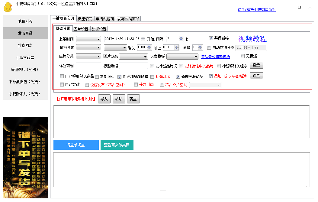 小鴨淘客助手是一款專為淘寶賣家們所準(zhǔn)備的輔助工具。小鴨淘客助手免費(fèi)版擁有低價(jià)引流、發(fā)布商品、排查同步及清理圖片等功能模塊,可支持一鍵采集其他店鋪信息和寶貝信息,圖片、資料、價(jià)格、庫(kù)存等內(nèi)容輕松采集,還可一鍵式智能發(fā)布寶貝,解放用戶雙手,提高商品上架速度。