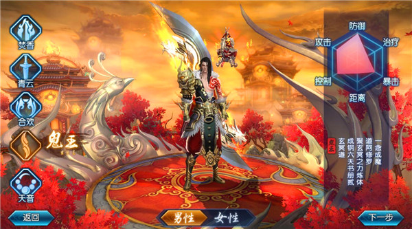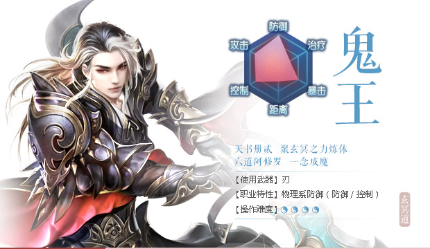 鬼王宗暗藏修羅之力,行事詭譎,造型霸氣橫生,一柄大刀似能橫掃天下。鬼王屬于坦克型職業(yè),同時(shí)具備擊暈?zāi)繕?biāo)的控制技能,吸收了西域修羅界的咒法化為己用,還可以召喚天魔元神附體使自身實(shí)力大增。50級(jí)時(shí)可修煉至第三重“邪冥”,所包含的“猛火咒”等技能,不僅能祭出元神提高自己的防御,更可造成大范圍傷害,可謂刀如燃烈焰,所向披靡。