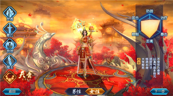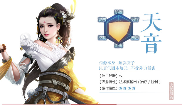 修煉大梵般若的天音,慈悲為懷,氣質(zhì)似已超然世外。天音寺持杖修行,技能多為法術(shù)系治療,以防守見(jiàn)長(zhǎng),招式如佛光普照,可以救濟(jì)世人,恢復(fù)氣血。第三重“佛陀”開(kāi)啟后,可修習(xí)“大梵般若”、“萬(wàn)象生佛”等技能,在給敵方以強(qiáng)大殺傷力的同時(shí),也能給自己和隊(duì)友持續(xù)的治療效果,似渡眾生于萬(wàn)劫。