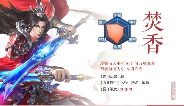 【焚香】焚香谷乃法術(shù)系職業(yè),手持刺,擅長(zhǎng)使用火系法術(shù)發(fā)動(dòng)遠(yuǎn)程攻擊。造成大范圍AOE傷害,一擊既出,足以令天地色變。在團(tuán)隊(duì)作戰(zhàn)中,焚香絕無(wú)僅有的控制技能和獨(dú)一無(wú)二的陣法還將起到重要的輔助作用。