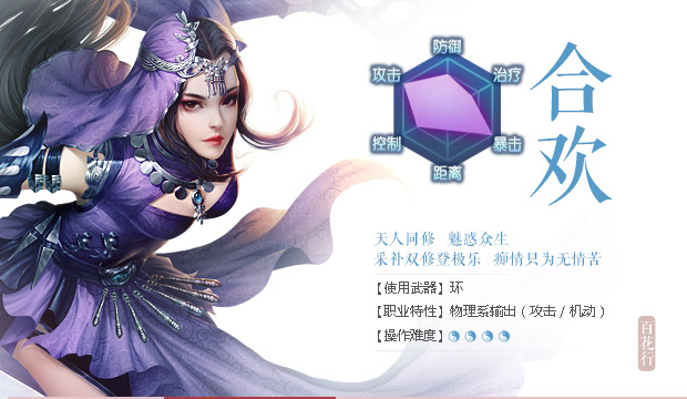 神秘莫測(cè)的合歡,紫袂翩然,魅惑眾生。合歡屬物理系輸出,單體強(qiáng)力輸出,同時(shí)也有魅惑敵人的控制技能。合歡出手講究“穩(wěn)準(zhǔn)狠”,功法大多迅速快捷,詭異多端,一旦出手,絕不留情,擅長(zhǎng)在無(wú)形之中取人性命。