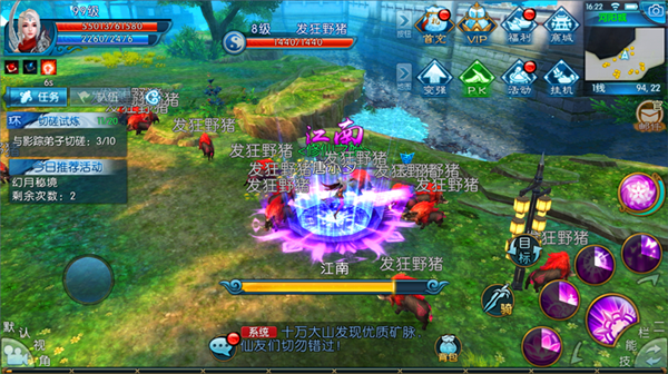 熟悉了如何操作,當(dāng)務(wù)之急就是殺怪升級(jí)啦!點(diǎn)擊右下角的技能圖標(biāo)即可釋放技能,使用藍(lán)色“目標(biāo)”的小按鈕可以切換攻擊目標(biāo)。