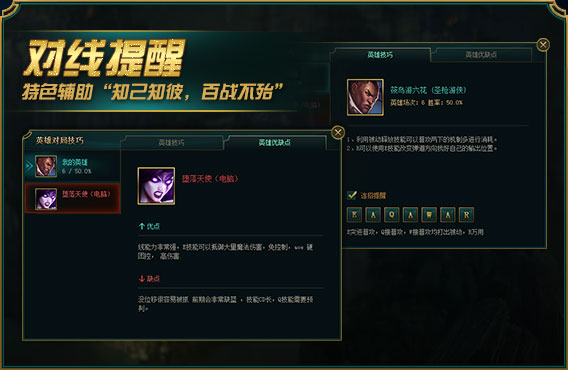 7、點(diǎn)擊LOL游戲界面右側(cè)的“對(duì)局技巧”按鈕,就可以查看當(dāng)前游戲中自己的英雄和短文所有英雄的“英雄技巧”和“英雄優(yōu)缺點(diǎn)”。以實(shí)現(xiàn)知已知彼,百戰(zhàn)不怠的對(duì)戰(zhàn)策略。