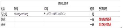 6.出現(xiàn)以上錯誤的解決方法:檢查反饋信息所對應(yīng)的姓名,姓名必須是中文漢字,不能帶有字母、數(shù)字、符號、空格鍵等,修改后保存文檔重新導(dǎo)入。