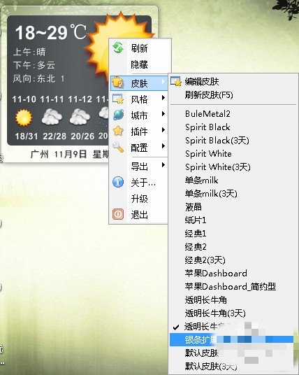 1、打開桌面天氣秀,右鍵點(diǎn)擊選擇皮膚,在選項(xiàng)中選擇合適的皮膚點(diǎn)擊替換即可