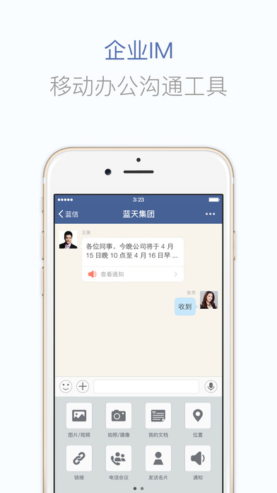 藍(lán)信手機(jī)版支持公有云服務(wù)、私有云部署、獨(dú)立部署,面向中大型和超大型組織提供基于組織通訊錄的即時消息、名片庫、工作群、文檔云盤、電話會議、廣播通知、圖文公告、會議管理、考勤管理、績效考核、數(shù)據(jù)上報統(tǒng)計、外部聯(lián)系人管理、系統(tǒng)對接等功能和應(yīng)用,致力于打造移動工作統(tǒng)一入口,打通組織邊界,