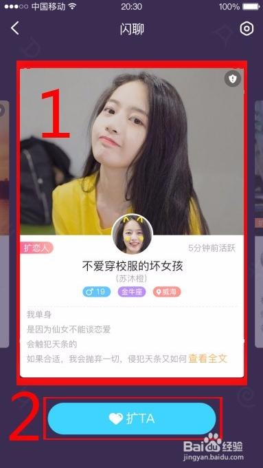 等待之后會出現(xiàn)諸多閃聊網(wǎng)友供自己選擇,左右滑動圖中數(shù)字“1”區(qū)域?qū)崿F(xiàn)切換,如果對這位“不愛穿校服的壞女孩”感興趣,點(diǎn)擊下方“擴(kuò)Ta”。