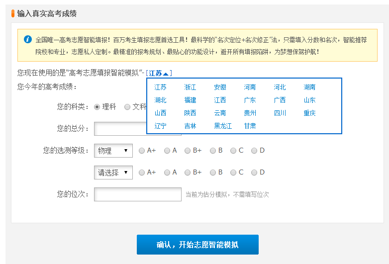 1、打開高考志愿填報(bào)智能模擬系統(tǒng)2、進(jìn)入模擬系統(tǒng),輸入你的真實(shí)高考成績