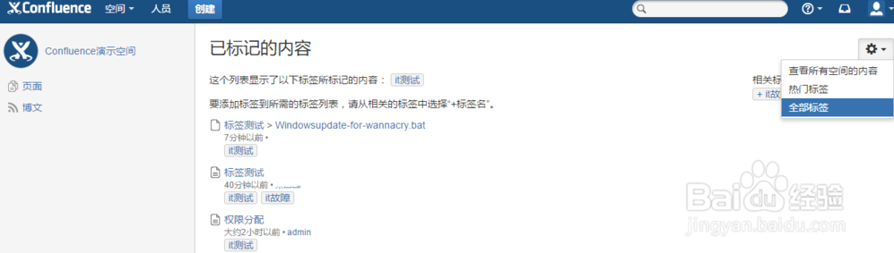 點擊空間中的“查看標簽”頁面查看空間中的全部標簽, 點擊任一標簽查看具有該標簽的頁面,并且可以進一步點擊標簽以得到滿意的結果