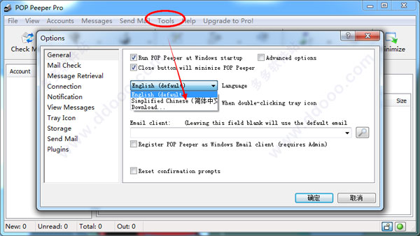 3、打開軟件,選擇【Tools】—【Options】—【Language】,將語言選擇為“簡體中文”,然后重啟軟件生效