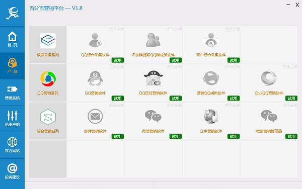 百分百營銷平臺由《百分百精英團(tuán)隊(duì)》打造的一款集下載、安裝、更新為一體的軟件管理工具,營銷平臺集成了市面廣受歡迎的幾款主流網(wǎng)絡(luò)營銷推廣軟件.產(chǎn)品包括QQ營銷、QQ采集分析、不加群提取群成員、營銷QQ輔助、微信營銷、郵件營銷、客戶綜合采集,用戶只需要有一個(gè)百分百賬號即可使用營銷平臺內(nèi)所有軟件,登錄營銷平臺即可以訂閱您所喜歡的軟件,一鍵式下載、安裝,統(tǒng)一的管理,讓您使用軟件更加輕松,高效,快Duang起來吧...【軟件特色】
