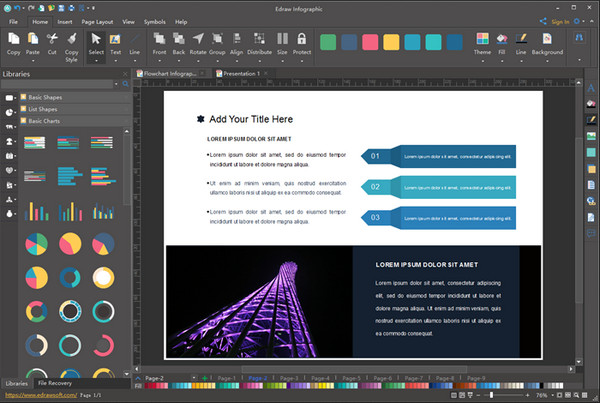 億圖信息圖制作工具是一款簡單易用、功能強大的平面設(shè)計工具。軟件提供了大量的矢量設(shè)計圖形以及富含創(chuàng)意的主題模板,通過簡單的拖拽填寫就可以設(shè)計完美的信息圖,PPT,海報傳單宣傳冊等。【軟件特色】