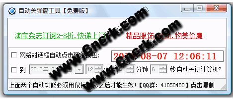 自動關(guān)彈窗工具 V1.0 簡體中文綠色免費(fèi)版 自動關(guān)彈窗軟件與電腦自動關(guān)機(jī)軟件合并版.自動選擇點(diǎn)擊網(wǎng)頁彈出的確定選項(xiàng) ,用于自動掛機(jī)學(xué)習(xí),游戲。并且可以自己設(shè)置自動關(guān)機(jī)時間。無需安裝,只需運(yùn)行軟件,選擇自動點(diǎn)確定的選項(xiàng)即可使用