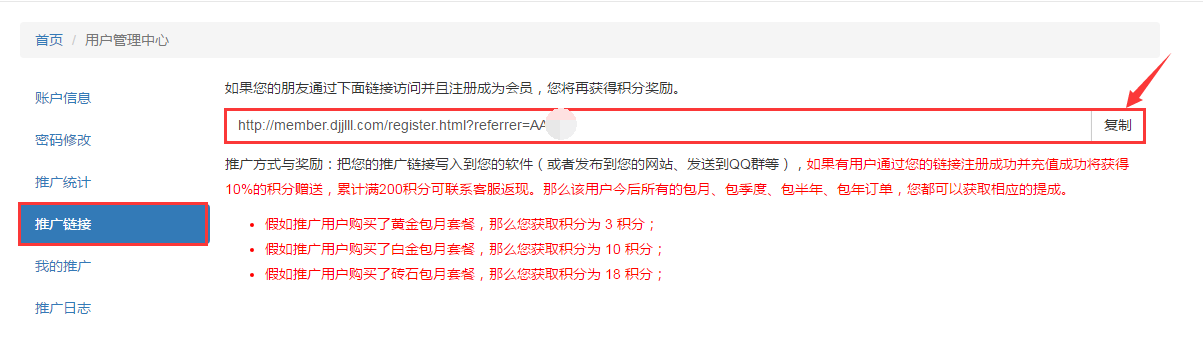 用戶推廣:在網(wǎng)站登陸您的賬戶即可看到您的推廣鏈接,復制您的推廣鏈接發(fā)給您的朋友注冊并充值會員即可贈送積分,積分累計滿200即可聯(lián)系客服返現(xiàn)。