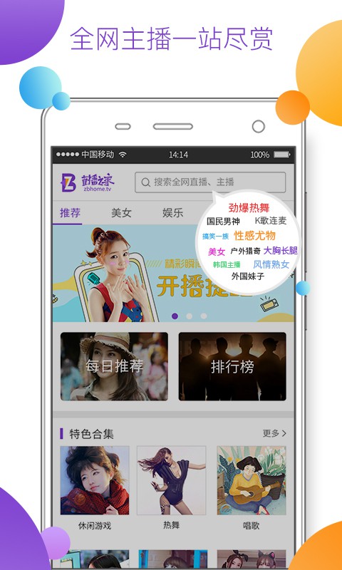 直播之家,超級(jí)好用的App!超In超Nice大照明星在這里,匯聚美女和男神愛的YY直播??幢槭澜缬螒蛑辈ィ谶@里久久游戲的看電競(jìng),和明星一起直播吃花椒和土豆,和小伙伴一個(gè)奔跑的看直播之家we are 伐木累 是不是很萌對(duì)嗎?讓又優(yōu)還酷的主播與你互動(dòng),超有料的撈月狗仔擁有明星的花絮,和小伙伴在動(dòng)物園看熊貓斗魚拔虎牙的風(fēng)云故事!【軟件特點(diǎn)】