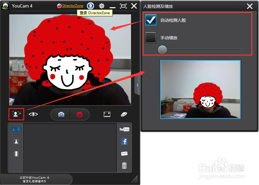 人臉檢測縮放——單擊此工具按鈕后,右側(cè)會自動彈出設(shè)置界面,您可以選擇“自動檢測人臉”和“手動縮放”來放大攝像頭捕捉到的人像