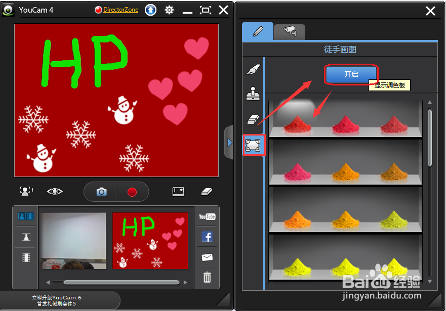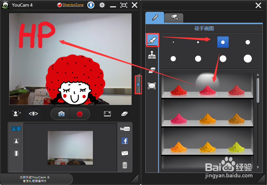 在拍攝時,為圖片添加一些有趣的元素。單擊窗口右側(cè)的箭頭圖標(biāo),您會看到有畫筆、印章、橡皮、調(diào)色板四個小工具。