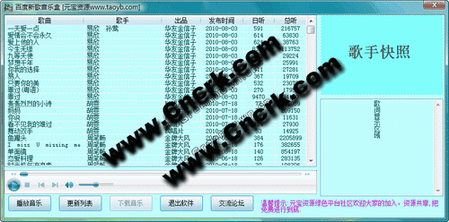 這個音樂盒是的好處就是百度音樂榜有新歌更新就會隨著更新列表,實(shí)現(xiàn)同時歌詞歌手信息下載同時,不足的地方就是不能自動按順序播放,不能窗口最小化,這些問等有時間再改進(jìn)吧。