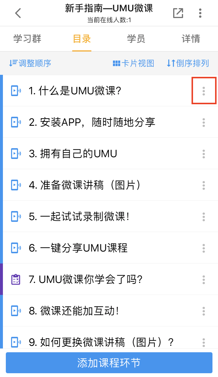 選擇需要導(dǎo)出視頻的微課,點擊右側(cè)“三個點”。