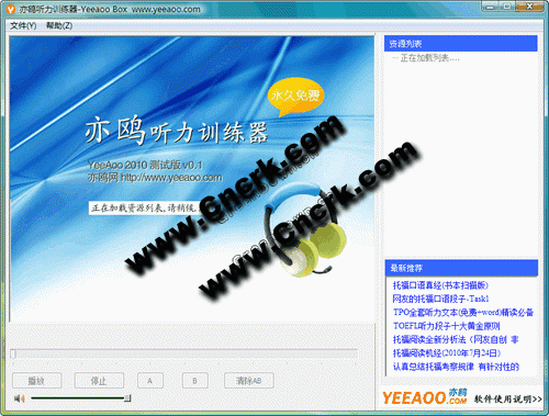 亦鷗英語聽力訓(xùn)練器 V0.1 簡(jiǎn)體中文綠色免費(fèi)版 亦鷗聽力訓(xùn)練器為亦鷗英語學(xué)習(xí)網(wǎng)特別為廣大網(wǎng)友所開發(fā),旨在幫助網(wǎng)友匯總和有效利用英語資源,本軟件自帶大量的英文音頻和文本文件,其中大部分為英文原版,以保障地道的英語。