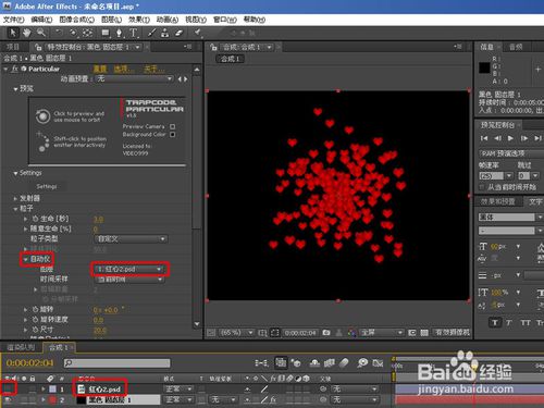 修改特效參數(shù),粒子發(fā)射類型改為圖層發(fā)色,就是layer,發(fā)射圖層,還有采樣方式的選擇見圖所示。另外粒子數(shù)改到20000左右。