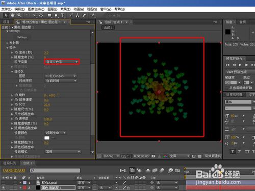 在logo圖層添加線性擦除,1秒是完成0,4秒完成100。新建一個(gè)純色層。添加粒子效果。