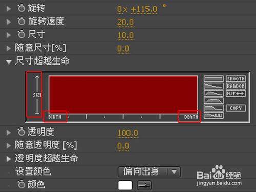 再看看透明度超越生命,哈哈翻譯有點(diǎn)難明白呀,來解釋一下吧,這個(gè)意思是粒子尺寸會(huì)根據(jù)粒子的生命誕生或消逝來控制透明度,可以看到OPACITY是尺寸,BIRTH為粒子誕生,DEATH為粒子結(jié)束,這個(gè)跟上面的尺寸超越生命同一理論就不解釋了,如下圖: