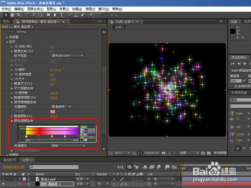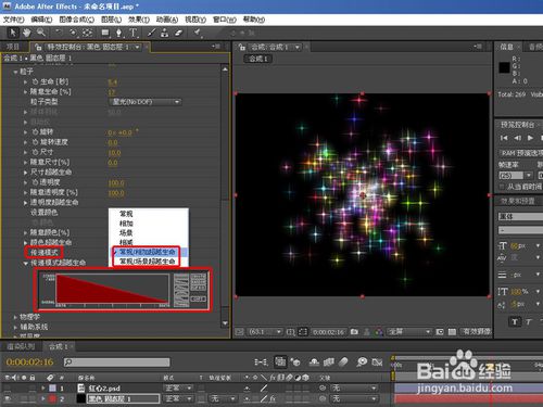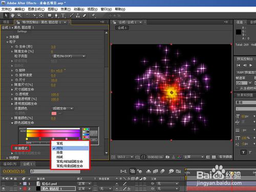 再來看看隨意漸變類型,跟上面生命類型差不多,只不過顏色設(shè)置為粒子顏色以漸變顏色演示,傳遞模式跟層的混合模式差不多,如下圖: