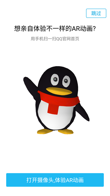 提示用電腦打開QQ官方網站http://im.qq.com,然后打開手機攝像頭對準屏幕,即可開啟AR(增強現實)體驗,也就是蹦出來一只立體化的企鵝。