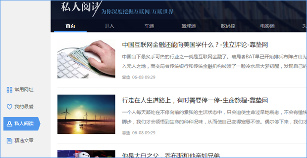 我的最愛全新推出的閱讀頻道,給你帶來前所未有的閱讀體驗。私人頻道,懂你所需,只給你最關(guān)心的資訊,如果你是NBA球迷,NBA的資訊就會擠滿你的私人頻道;精選文章,精品閱讀,每天為你推送質(zhì)量最高的文章,讓你讀的過癮,不浪費一分一秒。