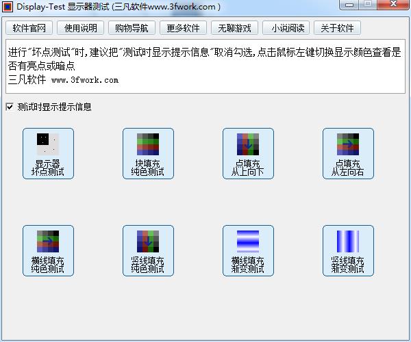 DisplayTest下載 v2.17 綠色免費版 DisplayTest是一款小巧簡單的液晶顯示器測試軟件。該軟件不僅可以免費檢測用戶的電腦顯示器狀況,還會準(zhǔn)時提供顯示器的測試信息,有需要的可以下載。功能包括顯示器壞點測試、塊填充純色測試、點填充從上向下、橫線填充純色測試、豎線填充純色測試等等測試功能。