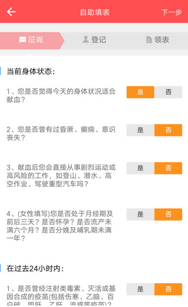 點(diǎn)擊自助填表,可以不用在血站填寫表格,通過(guò)今日獻(xiàn)血直接填寫表格,省去填表格的排隊(duì)時(shí)間!更加方便快捷。