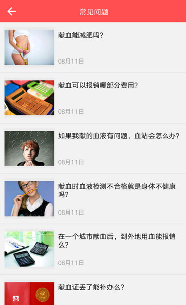 點(diǎn)擊常見(jiàn)問(wèn)題→可以看到獻(xiàn)血前后遇到的很多問(wèn)題,由專業(yè)醫(yī)師收集廣大獻(xiàn)血者常見(jiàn)問(wèn)題進(jìn)行系統(tǒng)性的分析解答,以便獻(xiàn)血者更加明白了解自身狀況,以及獻(xiàn)血時(shí)可能出現(xiàn)的狀況該如何應(yīng)對(duì)。