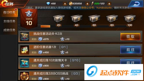 每日任務(wù)也是魂斗羅歸來(lái)中快速升級(jí)的最主要途徑之一。在游戲中,每日都有十幾個(gè)日常任務(wù)在等待著玩家來(lái)完成,完成任務(wù)之后將會(huì)有著豐厚的經(jīng)驗(yàn)獎(jiǎng)勵(lì),和一些鉆石金幣獎(jiǎng)勵(lì)。通常來(lái)講,如果能夠?qū)⑺械拿咳杖蝿?wù)都完成,有很大的幾率能夠連升一兩級(jí),即便等級(jí)高了,也能夠積累大把的經(jīng)驗(yàn)。