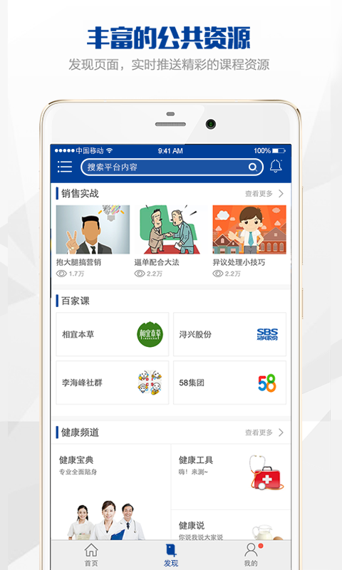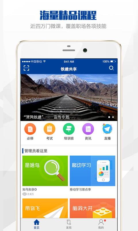 海量精品課程:鐵建共享近四萬門微課,覆蓋職場(chǎng)各項(xiàng)技能豐富的公共資源:發(fā)現(xiàn)頁(yè)面,實(shí)時(shí)推送精彩的課程資源