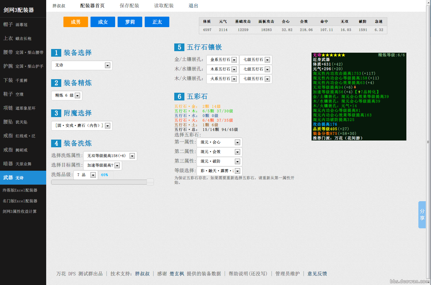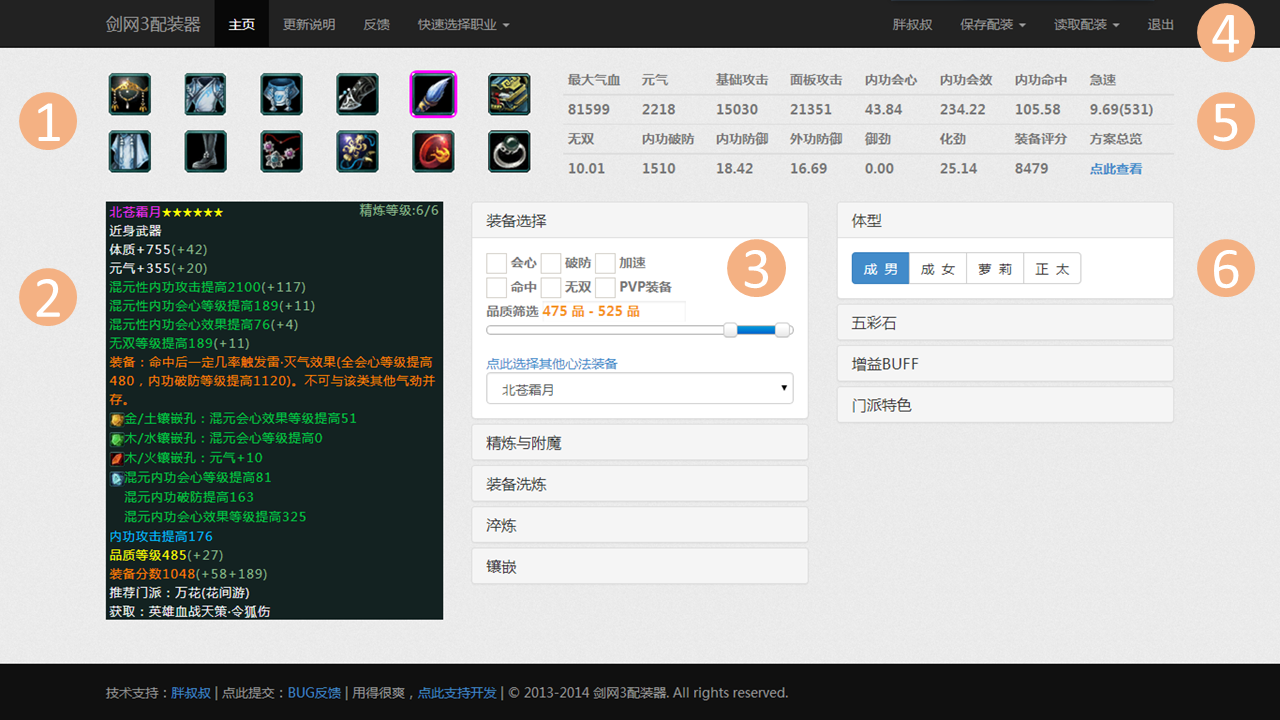 其中,1為裝備欄,用于顯示俠士所搭配的所有裝備的圖標(biāo)。玩家可通過點(diǎn)擊這些圖標(biāo)來選擇需要進(jìn)行調(diào)整的裝備。 2為裝備預(yù)覽區(qū),配裝器將會(huì)顯示當(dāng)前裝備位下所選擇的裝備,附魔,鑲嵌,洗煉和淬煉信息,顯示模式與游戲基本一致,無任何學(xué)習(xí)成本。 3為當(dāng)前裝備的操作區(qū),可對(duì)當(dāng)前裝備位進(jìn)行裝備選擇,精煉、附魔、洗煉、淬煉和鑲嵌,全方位模擬游戲中所有對(duì)裝備的操作。 4為用戶區(qū),用戶可通過此處保存、讀取已保存的方案,并可點(diǎn)擊用戶名進(jìn)入設(shè)置界面。 5為方案數(shù)值模擬區(qū),該區(qū)域?qū)?huì)顯示當(dāng)前裝備下與此心法相關(guān)的屬性數(shù)值,誤差極小,加速與命中等閾值屬性達(dá)到了0誤差。 6為方案設(shè)置區(qū),此處可以設(shè)置當(dāng)前方案的體型(體型對(duì)屬性有微弱影響),并可對(duì)武器進(jìn)行五彩石鑲嵌等。
