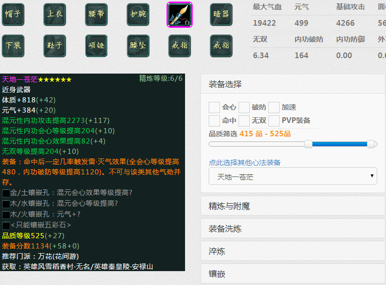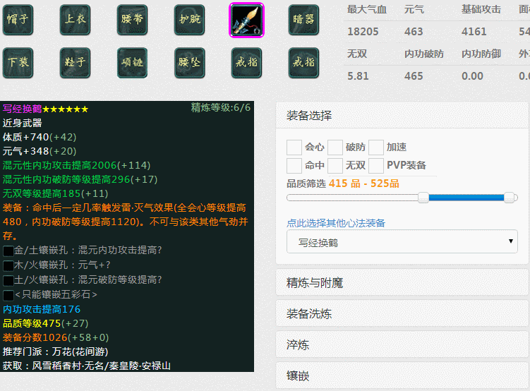 完成淬煉后,就應(yīng)當(dāng)鑲嵌五行石了。本工具對(duì)游戲鑲嵌也進(jìn)行了全方位的模擬。俠士可通過鑲嵌選項(xiàng)卡右上的滑動(dòng)條選擇需要鑲嵌的五行石等級(jí)(默認(rèn)為六級(jí)),然后將五行石拖放到左側(cè)鑲嵌孔中即可完成鑲嵌。裝備預(yù)覽區(qū)將會(huì)實(shí)時(shí)顯示出鑲嵌后的屬性。 五行孔淬煉同樣可以在這里完成,俠士可在此處修改鑲嵌孔的顏色,以方便激活五彩石。