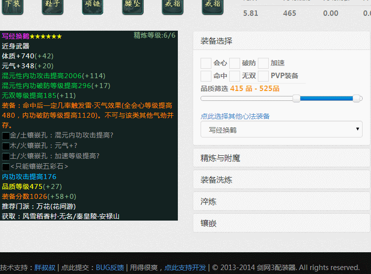 A:之前我錄入了一部分血戰(zhàn)天策版本的裝備,主要是武器、暗器、上衣、帽子和腰帶。不過由于之后體服的裝備名稱和數(shù)據(jù)都有變化,維護(hù)裝備數(shù)據(jù)是很麻煩的事情,所以我暫時(shí)停止了錄入新裝備。新裝備的數(shù)值將會(huì)在血戰(zhàn)天策公測(cè)當(dāng)天更新。
