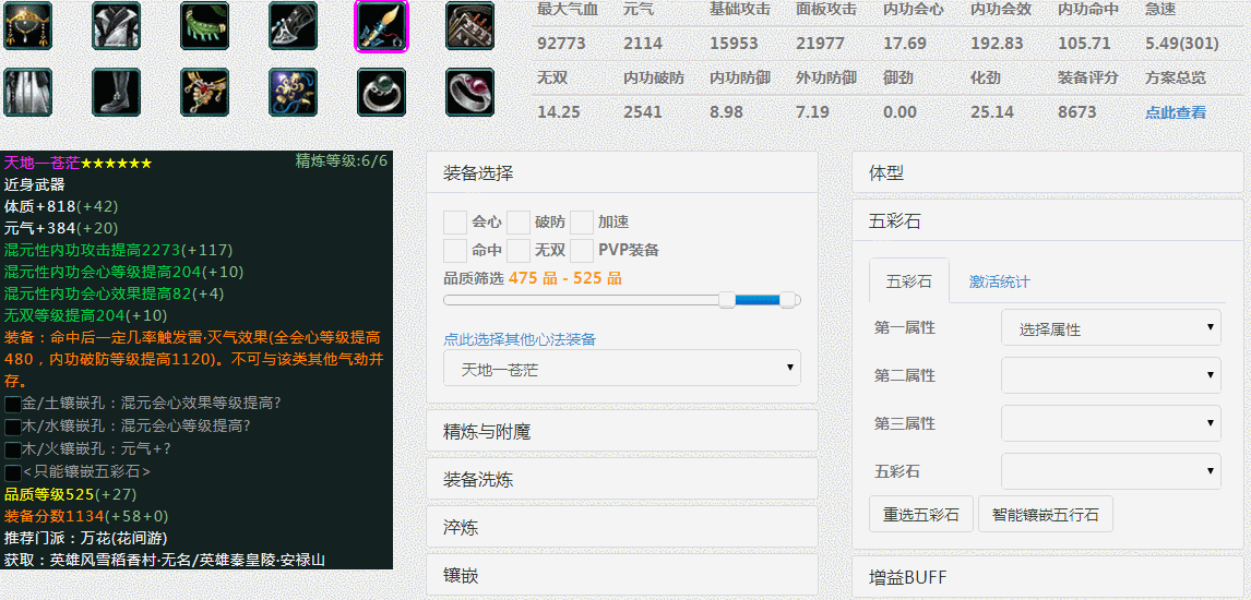 數(shù)值模擬區(qū)最右側(cè),有一個(gè)名為方案總覽的鏈接,點(diǎn)擊此鏈接將會(huì)彈出一個(gè)窗口顯示當(dāng)前方案下的所有操作。俠士可右鍵點(diǎn)擊圖片將圖片保存在自己的電腦上,方便隨時(shí)查看。以下為DPS心法下的裝備總覽圖:從左到右依次為裝備名稱(精煉等級(jí)),被洗煉屬性->洗煉目標(biāo)屬性,洗煉品級(jí)(洗煉比例),鑲嵌五行石屬性(鑲嵌等級(jí)),鑲嵌孔原屬性->淬煉鑲嵌孔,附魔。五彩石將會(huì)顯示在暗器的附魔位置。