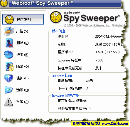 Webroots Spy Sweeper v4.5.9 漢化版(強(qiáng)大的木馬、鍵盤紀(jì)錄和廣告程序) Webroots Spy Sweeper v4.5.9 漢化版(強(qiáng)大的木馬、鍵盤紀(jì)錄和廣告程序)