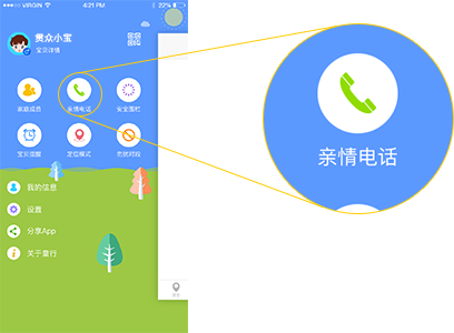 進(jìn)入APP—選擇相應(yīng)的寶貝—點(diǎn)擊寶貝頭像進(jìn)入側(cè)邊欄—親情電話界面,點(diǎn)擊設(shè)置親情號(hào)碼。