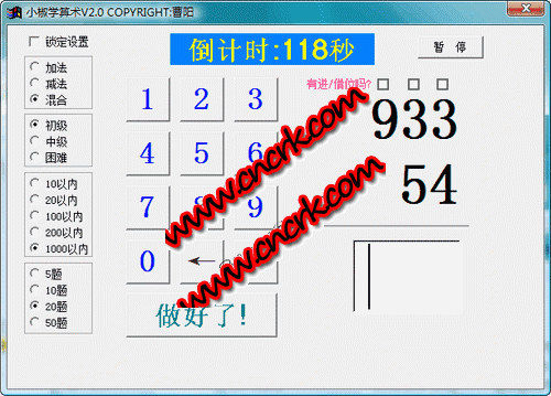 2、可用鼠標(biāo)也可用鍵盤(pán)輸入數(shù)字,在不同的難度級(jí)別時(shí)數(shù)字輸入順序不同,如在困難級(jí)別或20以內(nèi)的初級(jí)級(jí)別數(shù)字是從左到右輸入的,其它模式數(shù)字是從右到左輸入的(符合豎式計(jì)算先算個(gè)位再算十位的習(xí)慣)。