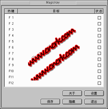 我們使用的鍵盤上,都有F1-F12這12個(gè)功能鍵??烧嬲褂盟鼈兊臋C(jī)會(huì)并不多。如何才能真正的將這些功能鍵完全利用起來呢?MagicKey 就可以讓你通過自定義之后,使用F1到F12這些功能鍵迅速地調(diào)出相應(yīng)的程序。我們不僅可以使用MagicKey 完成打開程序的操作,也可以用它來做一些其他的事:能打開指定的目錄,如“C:\WINDOWS”;能調(diào)用默認(rèn)的瀏覽器打開指定的網(wǎng)頁,如“www.21hh.net”;能調(diào)用默認(rèn)的電子郵件程序發(fā)送電子郵件,如“coolweicai@163.com”。MagicKey 還支持快速關(guān)閉計(jì)算機(jī)、重新啟動(dòng)計(jì)算機(jī)、注銷當(dāng)前用戶、運(yùn)行 MS-DOS、掛起計(jì)算機(jī)等操作。愿您使用計(jì)算機(jī)時(shí)更加方便、快捷!