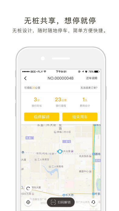 掃碼開鎖,關(guān)鎖自動計費,app預(yù)約選車,智能導(dǎo)航,續(xù)航實時可見。