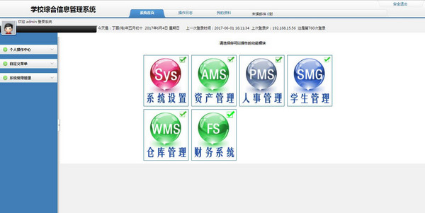 本系統(tǒng)旨在為在學校信息部門工作的同仁提供一個管理方便、實用、免費的管理系統(tǒng)。本系統(tǒng)在使用上不做任何功能限制,使用者可放心使用。本系統(tǒng)包含了豐富的管理模塊,比如倉庫管理,人事管理,學生管理,財務管理,學生學費管理,學生生活費管理,課程管理,校車及乘座管理等。使用中如有問題可與作者聯(lián)系