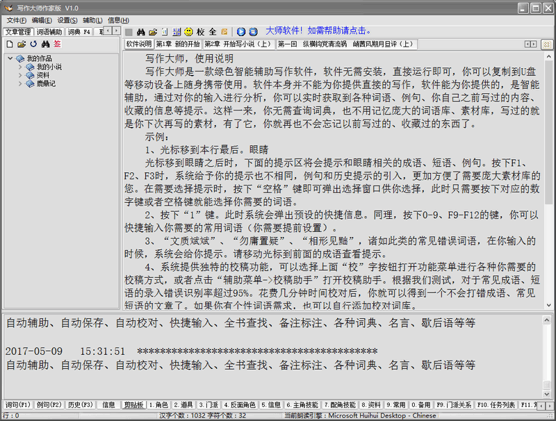 作為一個(gè)愛(ài)好看書(shū)的程序員,有感于作者碼字的辛苦,特別開(kāi)發(fā)本軟件,本軟件承諾終身免費(fèi)使用,免費(fèi)升級(jí)。寫(xiě)作大師是一款綠色智能輔助寫(xiě)作軟件,軟件無(wú)需安裝,直接運(yùn)行即可,你可以復(fù)制到U盤(pán)等移動(dòng)設(shè)備上隨身攜帶使用。軟件本身并不能為你提供直接的寫(xiě)作,軟件能為你提供的,是智能輔助,通過(guò)對(duì)你的輸入進(jìn)行分析,你可以實(shí)時(shí)獲取到各種詞語(yǔ)、例句、你自己之前寫(xiě)過(guò)的內(nèi)容、收藏的信息等提示。這樣一來(lái),你無(wú)需查詢(xún)?cè)~典,也不用記憶龐大的詞語(yǔ)庫(kù)、素材庫(kù),寫(xiě)過(guò)的就是你下次再寫(xiě)的素材,有了它,你就再也不會(huì)忘記以前寫(xiě)過(guò)的、收藏過(guò)的東西了。 自動(dòng)輔助、自動(dòng)保存、自動(dòng)校對(duì)、快捷輸入、全書(shū)查找、備注標(biāo)注、各種詞典、名言、歇后語(yǔ)等等,目前我們能想到的都開(kāi)發(fā)上去了,如果大家反響不錯(cuò)的話(huà),后續(xù)我們會(huì)繼續(xù)改進(jìn),爭(zhēng)取給廣大文字工作者減輕碼子的辛苦!【更新日志】