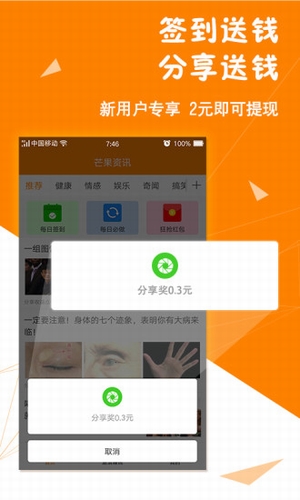 1、搜羅全網(wǎng)熱點,分享賺取收益無論是社會時事、各類段子、福利美圖、養(yǎng)生健康、運動技能……芒果資訊幫您一網(wǎng)打盡,讓你成為朋友圈有趣有范兒的話題達人。同時分享可賺取零花錢哦!