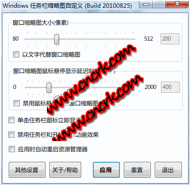 這個(gè)程序能夠?qū)?nbsp;Windows 7 中的任務(wù)欄實(shí)時(shí)預(yù)覽縮略圖進(jìn)行一系列個(gè)性化的調(diào)整,使其使用起來(lái)更炫更方便,避免了不方便的注冊(cè)表修改操作,將其轉(zhuǎn)化為方便圖形界面,只需要點(diǎn)幾下鼠標(biāo)就可以輕松設(shè)置。