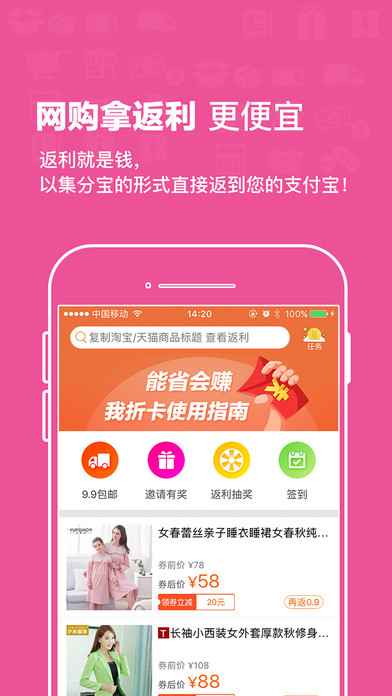 -超高返還:獨家超高返利、品牌特賣、九塊九包郵的特價商品,歷史最低價+超高返利+無理由賠付保障。省心網(wǎng)購,返還100%到賬。-邀請好友得獎勵:分享微信朋友圈,QQ好友,現(xiàn)金獎勵等你拿。