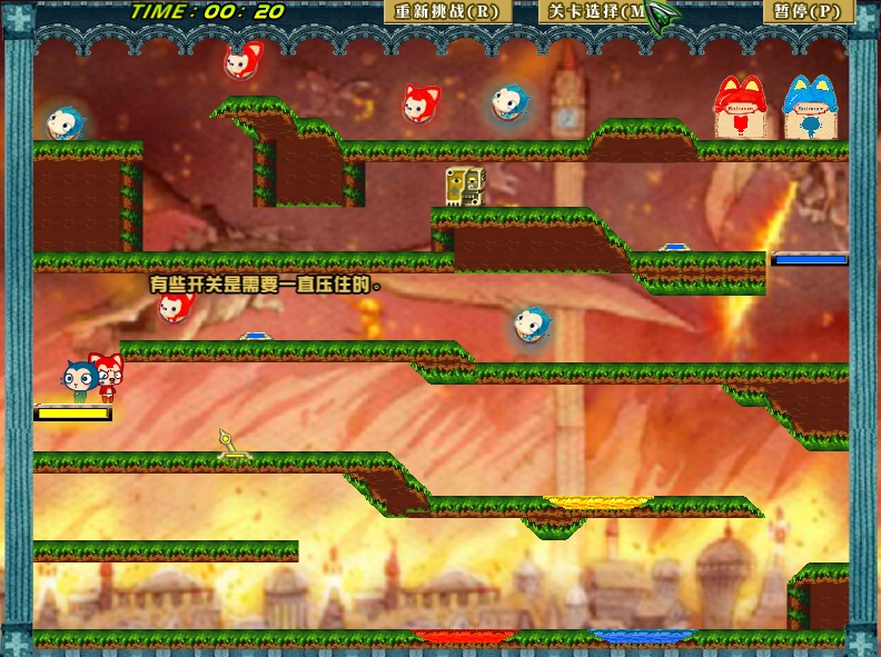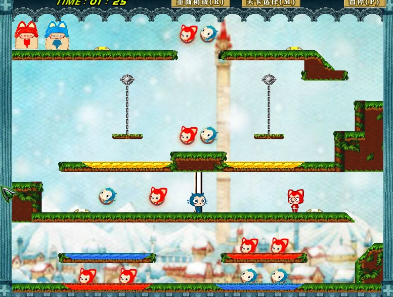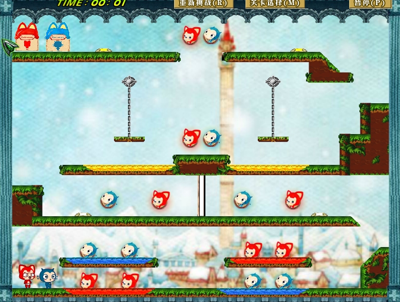 小狐貍阿貍可愛的形象深入人心,在游戲《阿貍勇闖冰火島》中可愛的阿貍帶著它的朋友一起來到冰火島冒險(xiǎn)啦。本作品支持兩人一起游戲,在游戲中玩家控制阿貍在冰火島展開冒險(xiǎn),注意冰火島充滿了危險(xiǎn),千萬要小心哦,而且有些關(guān)卡需要兩人齊心協(xié)力才能過去??旌湍愕男』锇橐黄饋碓囋嚢?。